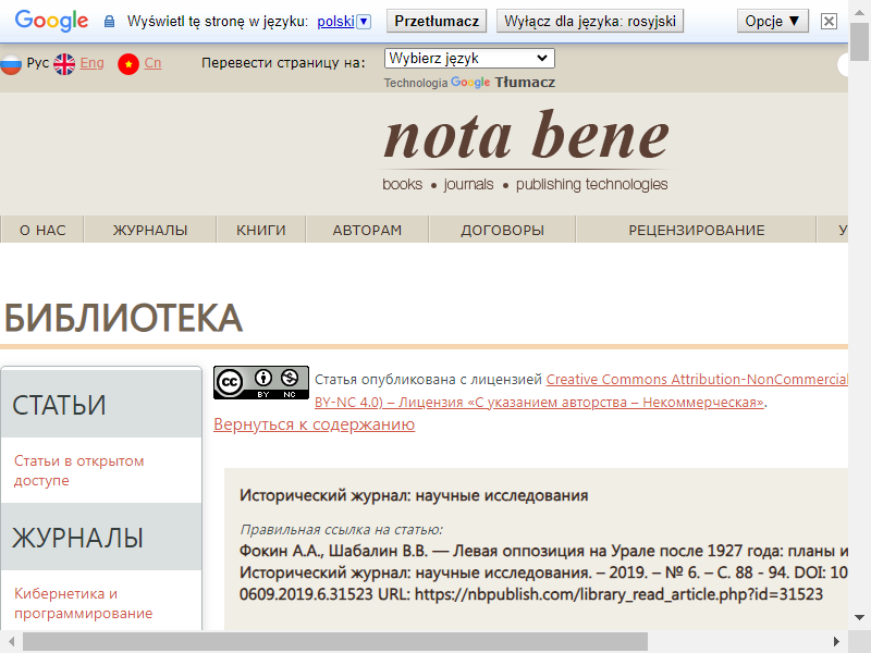 Фокин А.А., Шабалин В.В. Левая оппозиция на Урале после 1927 года: планы и судьбы // Исторический журнал: научные исследования. 2019. № 6