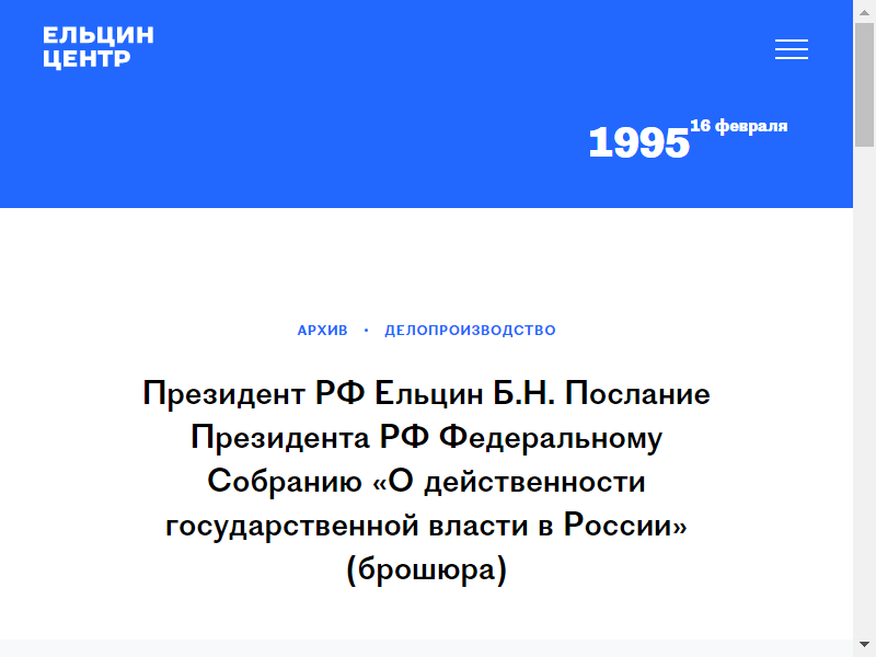 Послание президента России Б.Н. Ельцина Федеральному Собранию Российской Федерации. Брошюра «О действенности государственной власти в России». 16 февраля 1995 г.