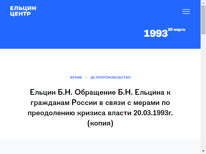 Обращение Б.Н. Ельцина к гражданам России в связи с мерами по преодолению кризиса власти. 20 марта 1993 г.