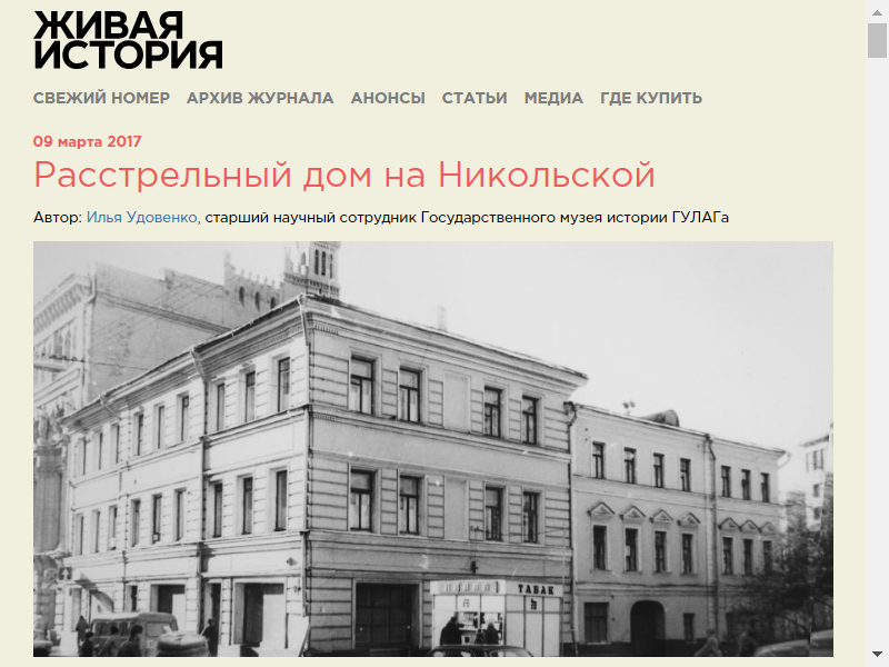 Статья старшего научного сотрудника Государственного музея истории ГУЛАГа И. Удовенко посвящена деятельности Военной коллегии Верховного суда СССР, которая с 1935 по 1950 гг. занимала здание на Никольской улице (в то время — ул. 25 Октября).