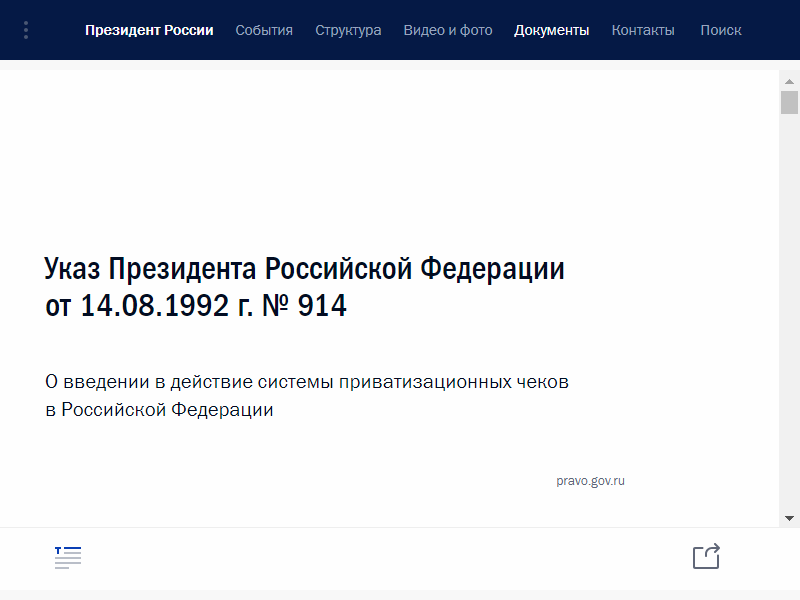 Текст указа Президента Российской Федерации от 14.08.1992 г. № 914 «О введении в действие системы приватизационных чеков в Российской Федерации».